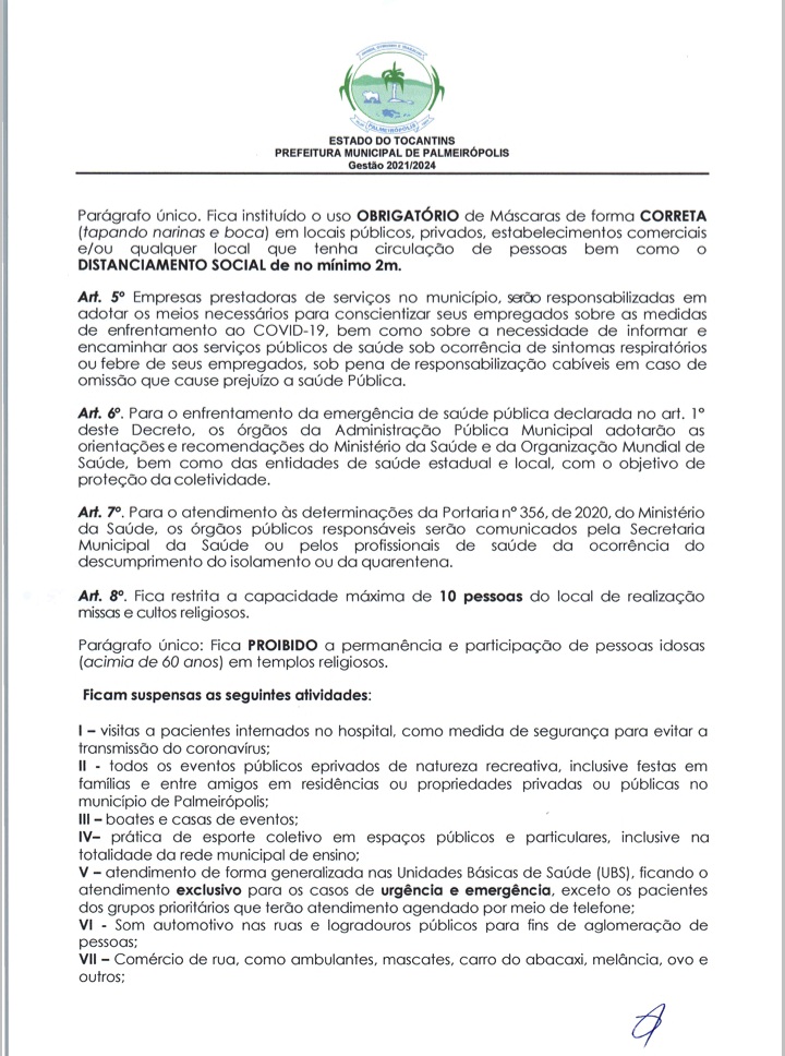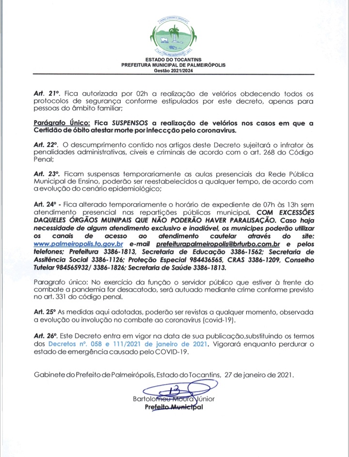 Através do decreto Municipal n° 112/2021 a prefeitura Municipal de Palmeirópolis no Tocantins renovou a validade das regras estabelecidas nos decretos anteriores que dizem respeito sobre o funcionamento dos estabelecimentos comerciais, dos templos religiosos e sobre a prática de esportes de natureza coletiva.